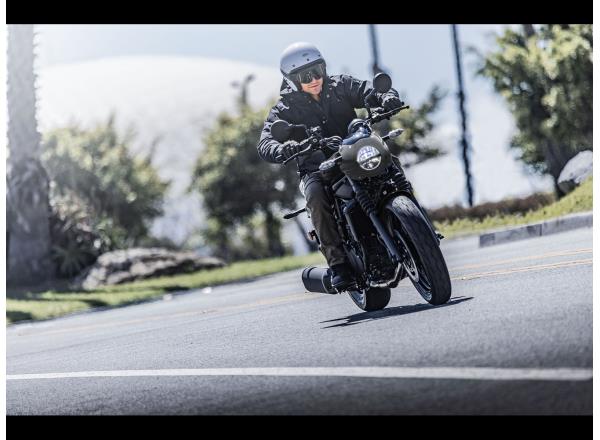 Compact, round, all-digital LCD instrument panel offers a modern touch that complements the Eliminator’s authentic style. The highly legible layout includes a barstyle tachometer and gear position indicator – visible reminders of the Eliminator’s active riding potential. Smartphone connectivity enables riders to access instrument functions for an enhanced motorcycling experience.